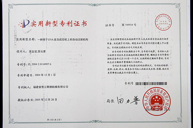 自動(dòng)注射機(jī)構(gòu)實(shí)用專利證書(shū)