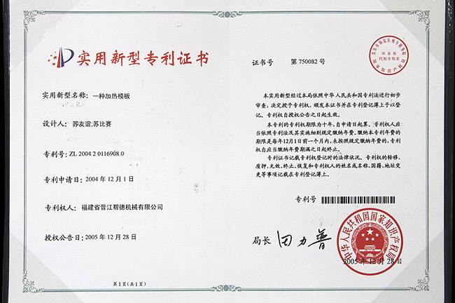 一種加熱模板實(shí)用專利證書(shū)