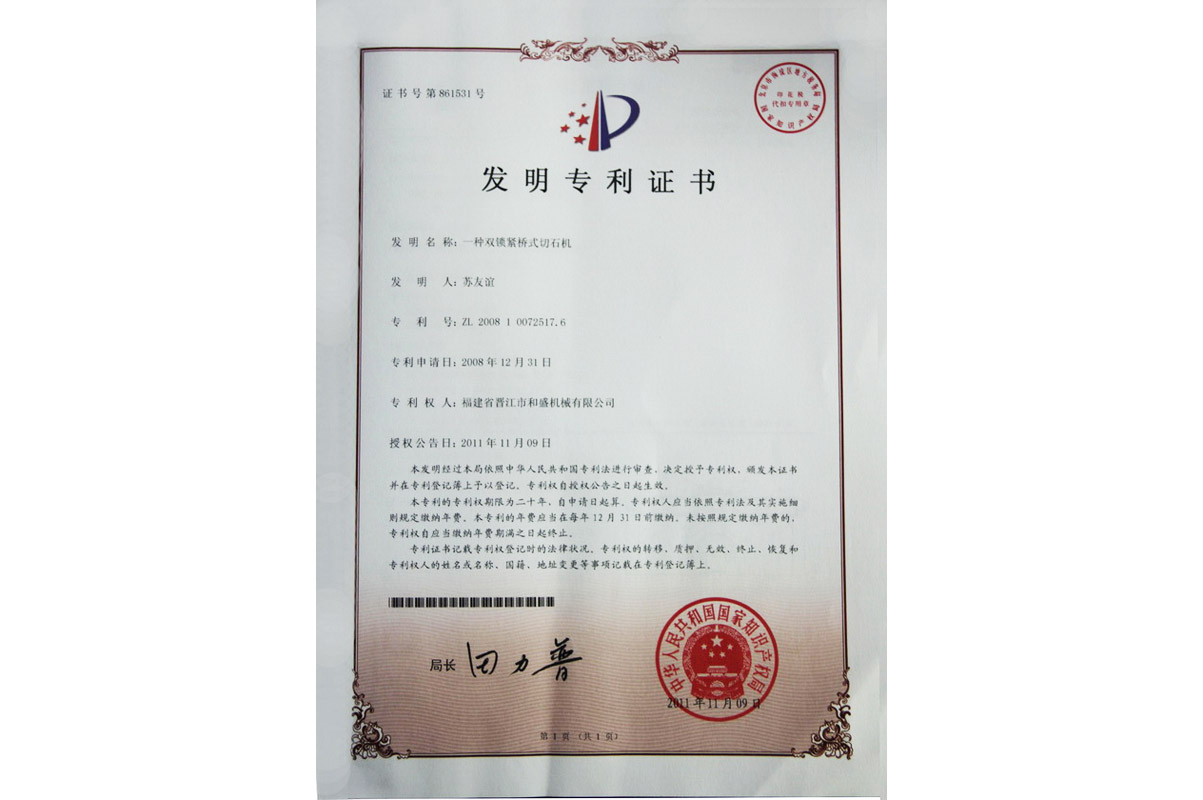 雙鎖緊橋式切石機(jī)發(fā)明專利證書(shū)