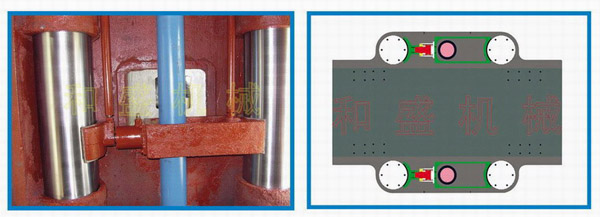 ?4:升降導柱與中座接觸面采用表面軋制美國杜邦“聚四氟乙烯”聚合物材料的導套;導套表面軋制成圓形儲油坑,在少油或間隙斷油條件下能正常工作,具有摩擦系數低,耐磨性能好,使用壽命長等優點。